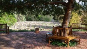 A view of the labyrinth from the seats around the Ulmus parvifolia Chinese Elm.