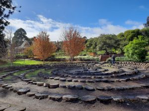 "The purpose of this labyrinth is to be an aesthetically pleasing element linking the gardens and Arboretum and to provide a beautiful, tranquil setting for contemplative walking – but feel free to run, skip or dance it! It is located on the original site of Peter Waite’s tennis courts, overlooked from the Rose Garden with a wonderful view towards the Arboretum.
