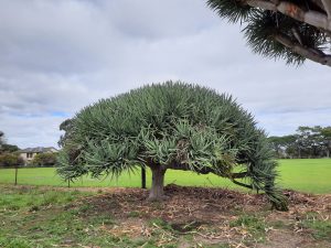 Dracaena: Around the world the the Dracaena genus has about 120 species of trees and shrubs. The arboretum's dracaena specimens can be found in a number of areas of the Arboretum as individual majestic single specimens, as unique collection along the Waite Oval fence line and the 'Baby' Dracaena collection near the Dr David Symon seat. The sword-like leaves of the dracaena make excellent basketry and weaving materials. #1715 Dracaena draco Dragon Blood's Tree is the tree used for Friends of the Waite Arboretum's logo. The scientific name of the Dracaena draco is derived from latin: dracaena (she – dragon) and draco dragon. The common name is linked to the deep the red colour of the dried sap of the Dragon Blood's Tree