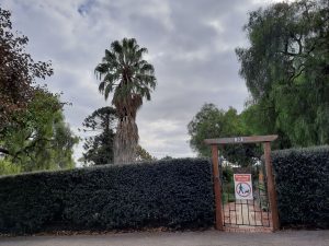 Gate 26 Entrance east of Waite Oval in Claremont Avenue. . On the left inside the gate is #2160 Pinus canariensis Canary Islands Pine planted in 1994. On the right is #542 Pinus halepensis Aleppo Pine PINACEAE