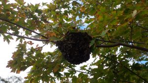A European honey beehive on a branch of the #2192A Acer x freemanii 'Jeffersred' Autumn Blaze tree, April 2020. The tree was planted in 2009.