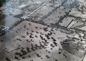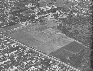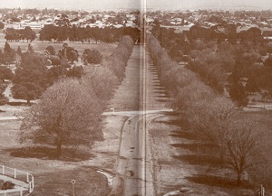 Left: Urrbrae Estate 1919 "Aerial view (looking east) of Urrbrae estate taken by Frank Hurley in December 1919.  Urrbrae House, surrounded by gardens and orchards is located on the right side of the photo.  The original tree-lined drive still used today can be seen sweeping towards the house from the bottom left corner."  Source: The University of Adelaide, Urrbrae House in Zeitz, 2014, p.8).  Centre: The Waite Arboretum Research Institute 1976 Research Fields, Laboratories, Arboretum. Source Edgelow, 1984, p.90.   Right: Pre 1974, Waite campus / Arboretum's Elm Avenue looking west.  The Ulmus x hollandica, Dutch Elms were planted in 1928. Source: Edgeloe, 1984, inside cover. PLEASE NOTE: In 2019 there was change in the identification of Elm Avenues' Ulmus procera English Elms to Ulmus x hollansica Dutch Elms.