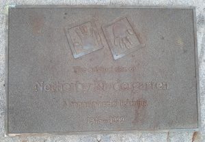 Netherby Kindergarten Arboretum sign: "The original site of Netherby Kindergarten A happy place of learning 1945 – 1999", Arboretum's south west corner in Claremont Avenue.